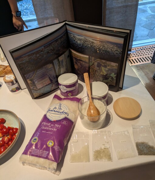 ル・ゲランドはブルターニュ地域ゲランデで2000年以上にわたって塩つくりを行う生産組合。1000年以上昔につくられた「塩田」で、時間をかけて海水を濃縮することでミネラルの結晶化を促し、マグネシウム、カルシウム、鉄分などの自然のミネラル分を含む100%自然の海塩を提供する。砂の色でもある灰色の天然色をしていることでも有名。