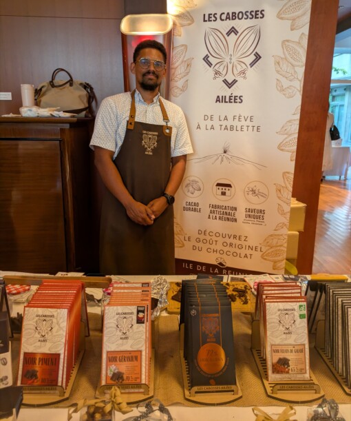 レユニオン島で地元固有種ブルボンポワンチェのカカオ豆作りに情熱を注ぐリシャール・ローレ氏一族。「カカオの豆のおいしさを、ショコラに最大限に生かし、芳醇なアロマと島らしいエキゾチックさを表現した」と語った。また島ではカボス、ミカンなどの柑橘系果物や、バードとうがらし、黒コショウなどのスパイスも栽培される。それらをチョコに絶妙に取り入れてエレガントかつ芳醇に仕上げたショコラも素晴らしい。