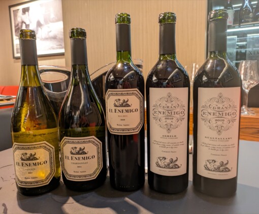 ②③⑤にはグアルタジャリー地区の葡萄がブレンドされている。標高の高さから生まれる美しい酸ときれいに完熟した芳醇なおいしさを感じる。特に⑤はパーカーポイント100、ジェームスサックリングの評価本でも100ポインを獲得した傑出したワイン。標高1470mのグアルタジャリーの樹齢50年のカベルネ・フランが85%占める。この高い標高の畑は豊かに紫外線を浴びるので果皮が熱く芳醇な味わい、かつPHが高いがアルコール度数が高すぎない非常にエレガントなワインだった。
