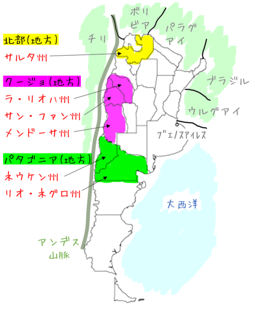 アルゼンチンのワイン産地の大きな特徴は、アンデス山脈の麓に沿って、国土を南北に縦断する広大な帯状のエリアに広がっていること。アルゼンチンのワイン畑に行くとどこからも雄大なアンデス山脈が望め、その美しさに圧倒される。このアンデス山脈が大平洋から来る湿気や雨雲を遮断してくれ、一方で山脈から夏は冷涼な風をもたらし、葡萄が過熟にならずエレガントな美しい酸をキープする。
