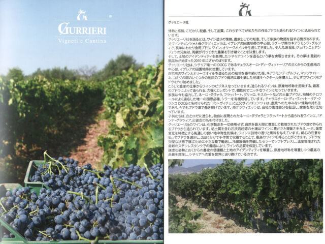 現在では畑をすべて有機栽培に転換し、ネロ・ダーヴォラ、フラッパート、グリッロなどの土着品種と、シチリアの土壌と気候によく適応した国際品種であるシラーも栽培しているグリエリだが、それぞれのワインは2000~4000本程度と少量生産でラグーザ地方の農業と地域の伝統を反映させている。